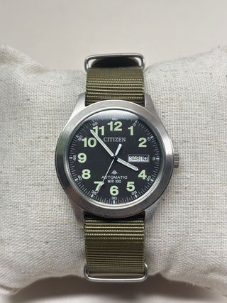 Reloj Citizen automático con correa Nato. - Esfera negra. - Resistente al agua WR 100. - Correa de nylon color verde oliva. Nuevo, impecable.