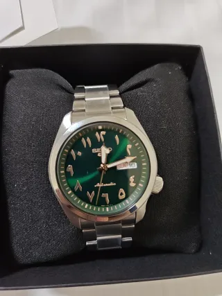 Reloj Seiko 5 con esfera de diseño árabe en color verde. La correa es de acero inoxidable. - Esfera con números arábigos. - Correa de eslabones plateada. Nuevo sin estrenar, modelo exclusivo de Arabia saudita