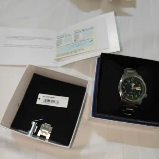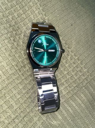 Elegante reloj con esfera verde y detalles plateados. - Bisel giratorio verde. - Correa de eslabones plateada. - Indicador de fecha. -Nuevo -Precio asequible - puedo enseñar fotos mas detalladas