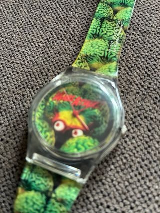Reloj de pulsera Swatch con diseño inspirado en la película Mars Attacks. - Correa con estampado de cerebros verdes. - Esfera con diseño temático de la película. - Pila agotada se ha de cambiar
