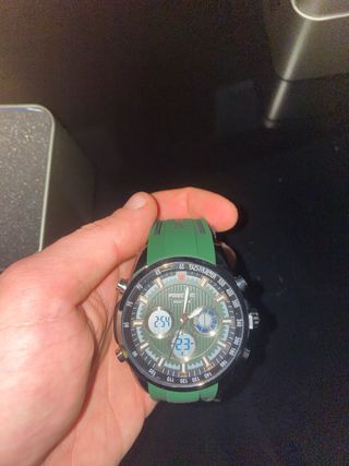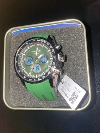 Reloj Fredric Tourbillon sport dual time, nuevo a estrenar. Incluye: - Caja original - Tarjeta de garantía - Etiquetas Características: - Función dual time - Estilo deportivo - Correa de goma verde Reloj robusto y moderno, ideal para uso diario o actividades deportivas.