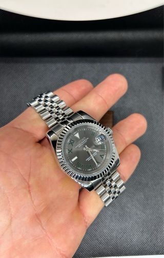 Reloj daydate rose gold - Mecanismo japonés miyota 8215. - Cristal de zafiro antirayaduras. - Mecanismo automático ⚙️. - Tapa trasera de Cristal. - Dial de color verde oliva. - Detalles en tono rose gold. - Caja y correa en acero inoxidable. Pedidos personalizados y encargos al 61 11 92 40
