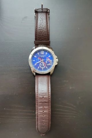 03-U589899 Buen estado. Reloj elegante con estilo clásico y moderno, correa de cuero y esfera oscura que permite ver parte del mecanismo. Ideal para uso diario o para vestir, combinando elegancia y funcionalidad. 3 años de garantía. Disponible sólo para envío mediante wallapop o compra directa en nuestra web realcash. es. Enviamos a toda España excepto Canarias, Ceuta y Melilla.
