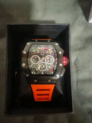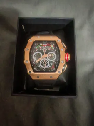 Elegante reloj con detalles dorados y rojos. - Diseño moderno y llamativo. - Correa cómoda y ajustable.