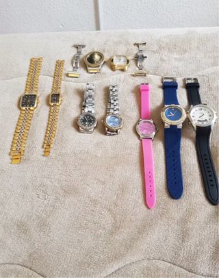 Conjunto de nueve relojes de diferentes estilos. - Dos relojes con correa dorada y esfera negra. - Dos relojes con correa plateada y esfera azul. - Un reloj con correa plateada y esfera negra. - Un reloj con correa rosa. - Un reloj con correa azul. - Un reloj con correa negra. - Un reloj con esfera dorada. No ago envios no me desplazo solo ago trato en mano soy de alcorcon central gracias .