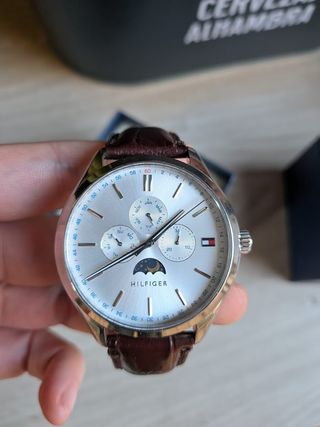 ¡Hola! Vendo este Tommy Hilfiger modelo Oliver porque no le doy uso. Me lo habré puesto un par de veces para eventos y está como nuevo, sin rayones en el cristal. Es muy elegante, con esfera blanca y correa de cuero marrón original. Detalles: Estado: Reestreno. Funciones: Calendario (día/mes) e indicador de fase lunar. Extras: Incluyo su caja original y almohadilla.