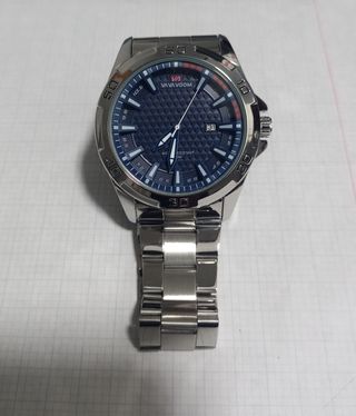 Reloj de pulsera con esfera azul y detalles plateados. - Puesto en dos ocasiones. - Correa de eslabones plateada. - Indicador de fecha. - tiene todos los eslabones.
