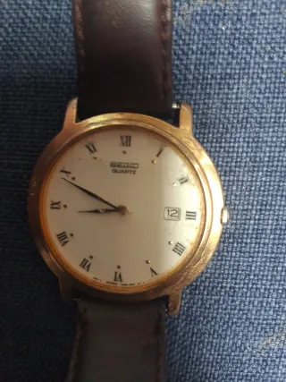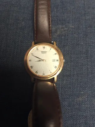 Elegante reloj Seiko con correa de cuero marrón y detalles dorados. - Esfera blanca con números romanos. - Ventana de fecha. - Movimiento de cuarzo.