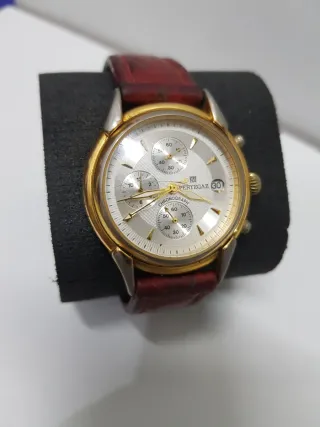 Elegante reloj PERTEGAZ con función de cronógrafo. Su diseño combina detalles dorados con una correa marrón. Cristal roto - Esfera con indicadores de cronógrafo. - Ventana de fecha.