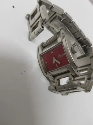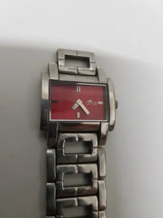 Elegante reloj Lotus con una llamativa esfera rectangular. Falta diente - Diseño moderno y sofisticado. - Correa de eslabones metálicos. - Combinación de colores rojo y plateado.