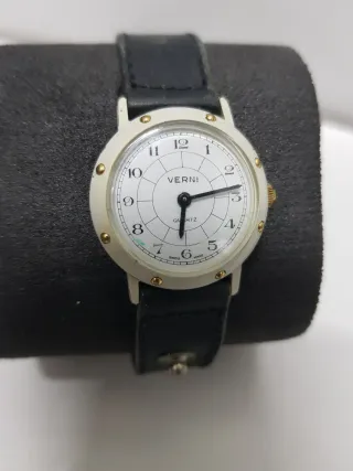 Elegante reloj de pulsera con correa de cuero. - Esfera blanca con números arábigos. - Bisel plateado con detalles dorados. - Correa de cuero negra.