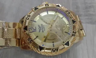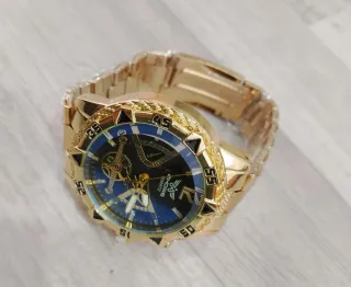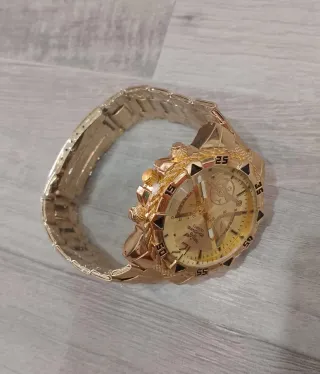 Elegante reloj con acabado dorado y detalles en azul. - Diseño llamativo con bisel texturizado. - Correa metálica dorada. - Esfera con marcadores y manecillas doradas.