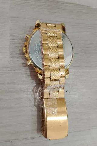 Elegante reloj de pulsera con un acabado dorado brillante. Su diseño moderno lo hace un accesorio llamativo. - Esfera redonda con detalles. - Correa metálica a juego.