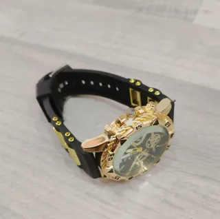Elegante reloj con detalles dorados y correa negra. - Diseño llamativo con esfera detallada. - Correa de material resistente.