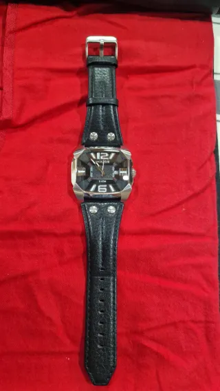 Reloj de pulsera con correa de cuero negra. - Esfera cuadrada con detalles plateados. - Cierre de hebilla metálica. - Resistente al agua 5 ATM.