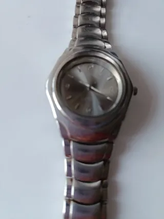 Elegante reloj de pulsera con brazalete de acero. - Diseño moderno y minimalista. - Acabado plateado brillante. - Correa de eslabones. - Cierre de seguridad.