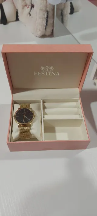 Elegante reloj Festina para mujer, a estrenar y en su caja original. - Diseño con detalles en plateado. - Caja y correa de metal. - Cierre de seguridad.