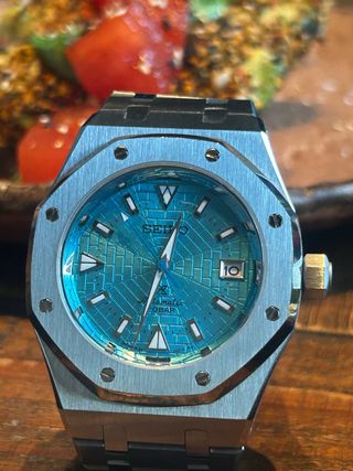 Reloj automático Seiko Mod “blue Sky” edición limitada con un diseño llamativo. - Esfera de color azul con patrón texturizado. - Bisel octogonal con tornillos. - Correa de acero inoxidable 316L y cristal de zafiro -Maquinaria Japonesa NH35A Este reloj tiene un valor muy especial para mi