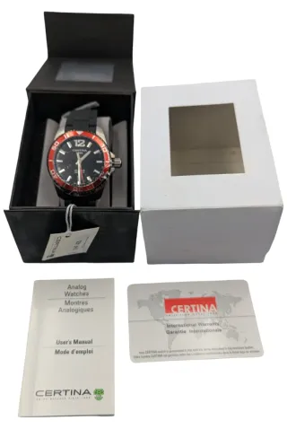 Reloj SWISS MADE Marca CERTINA Nuevo a Estrenar MODELO "C013.410.27.057.00" Modelo AQUA DS ACTION..Diseño DEPORTIVO y ELEGANTE..Movim. SWISS MADE Cuarzo-Analógico,Calibre ETA F06.111, 4 JEWELS..Caja de ACERO INOX de 40.5 x 10.8 mm, Bisel GIRATORIO UNIDIRECCIONAL ACERO PVD NEGRO/ALUMINIO ROJO con TIEMPO TRANSCURRIDO,Corona A ROSCA..Cristal de ZAFIRO ANTIRREFLEJO.Esfera NEGRA,Agujas,Número e Índices LUMINISCENTES,CALENDARIO NUMERAL 6HS,SISTEMA DS (DOLBLE SEGURIDAD) Que Consta de ELEMENTOS ADICIONALES que Garantizan La ALTA DURABILIDAD y RESISTENCIA al AGUA,EOL (Aviso de Baja Batería).Correa de CAUCHO,Cierre MARIPOSA.Resiste 200 M🎁🎁