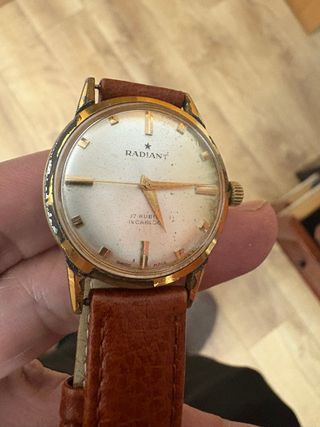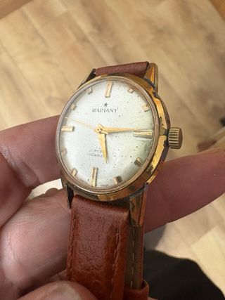 Preciosa pieza de relojería. Un reloj de cuerda Radiant de estilo clásico. - Mecanismo automático. - Caja dorada. - Correa de piel marrón. - Funciona correctamente - diametro con corona 33.