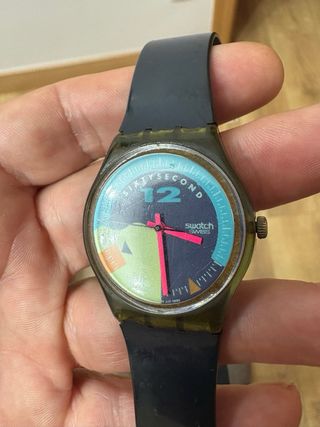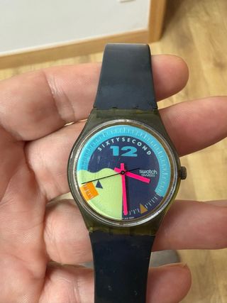 Reloj Swatch Sixty Second de mujer, en buen estado. Es un reloj de diseño vintage con una estética colorida y llamativa. - Modelo Sixty Second. - Correa de plástico azul oscuro. - Caja de plástico transparente verdoso. -pila nueva