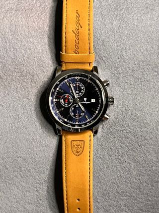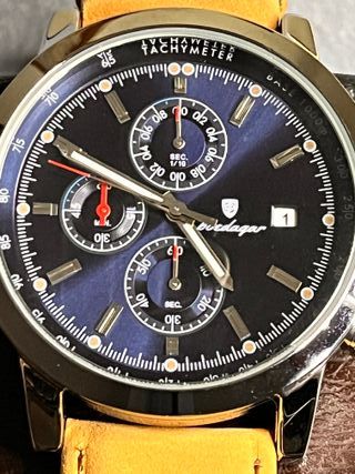 Bonito reloj cronógrafo Poedagar 932 Blue, de 44 mm de diámetro de caja de acero inoxidable. El movimiento es de cuarzo y el reloj tiene 3 bares de resistencia al agua. Dispone de segundero en posición central y tres subesferas destinadas al cronómetro para minutos, segundos y décimas de segundo. Dispone de fechador. El fondo azul del reloj combina perfectamente con la correa de cuero color mostaza. Reloj completamente nuevo, con caja y etiquetas. No dudes en pedir más información, fotos o videos.