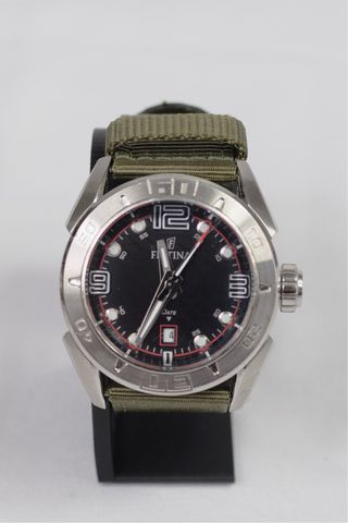 Reloj de pulsera Festina con una combinación de colores plateado y verde. - Correa NATO nueva de tela verde. - Caja y bisel de acero. - Esfera oscura con detalles en rojo y blanco. - Indicador de fecha. - Pila recién cargada