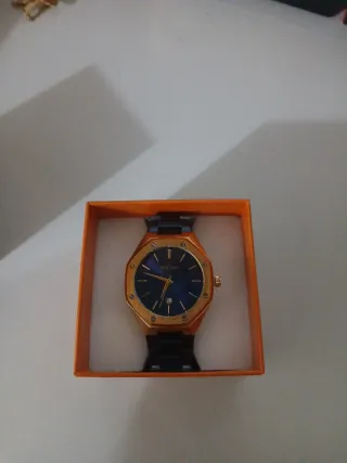 Elegante reloj con esfera azul y correa negra. - Diseño moderno y sofisticado. - Detalles plateados en la caja y la esfera Precio debatible.