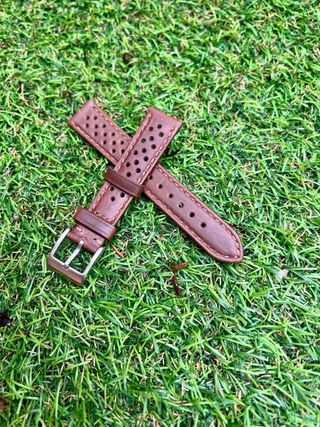 Correa de piel estilo Racing en color marrón oscuro. Diseñada para un look deportivo y clásico. - Ancho de 20 mm. - Costuras blancas. - Hebilla metálica plateada.