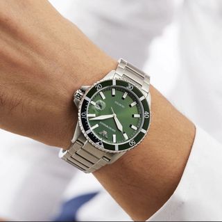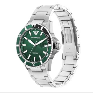Elegante reloj Emporio Armani, nuevo en su caja, con certificado, esfera verde y detalles plateados. - Bisel giratorio con marcadores. - Correa de eslabones de acero inoxidable. - Resistente al agua hasta 100 metros. Reloj Emporio Armani AR11338 Verde/Plata
