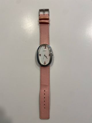 Elegante reloj de pulsera con un diseño ovalado. - Correa de cuero rosa. - Esfera blanca con números en tono rosado. - Bisel plateado.