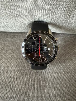 Reloj TAG Heuer Carrera Calibre 16 comprado en 2008. Tiene los signos de desgaste normales de tener esos años, algunos roces en la caja y cierre, micro arañazos, etc. La correa se acortó ligeramente al comprarlo. Pero es la original con el cierre original. No conservo la caja. No se ha ajustado en los últimos años pero funciona correctamente. - Esfera negra. - Correa de caucho negra. - Bisel con taquímetro. - Ventana de fecha. - Movimiento automático.