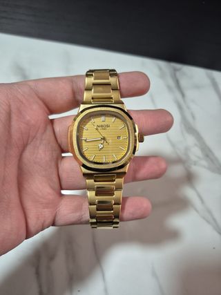 Vendo este elegante reloj estilo Nautilus de 42 mm, con un diseño moderno y llamativo gracias a su acabado dorado y su esfera negra con agujas Mercedes en blanco y dorado. Un reloj con presencia premium a un precio increíble. Precio: 12 € — Nuevo con caja Características principales Caja: 42 mm de acero inoxidable Correa: Acero inoxidable dorado Color: Dorado con esfera negra Agujas: Estilo Mercedes en blanco y dorado Resistencia al agua: 30 m (salpicaduras y lluvia) Incluye caja de presentación Incluye herramienta para ajustar la correa Estilo Nautilus (inspiración)
