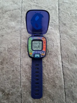 Reloj interactivo con diseño de PJ Masks. - Tapa protectora con diseño. - Correa ajustable con motivos. - Pantalla con personajes. - El botón de ok funciona dándole en el lado derecho.