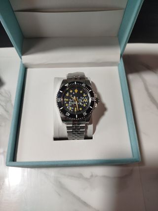 Caja 42mm y correa Jubilee en acero 904L ➤ Hiperresistente, mayor brillo y calidad superior al 316L Bisel negro estilo GMT Dial “Fantasmas” ➤ Índices blancos que brillan en la oscuridad ➤ Fondo negro + números amarillos ➤ Agujas doradas y blancas para máxima visibilidad Cristal de zafiro anti-rayones Movimiento automático DG2813 ➤ Preciso, fiable y suave Trasera abierta con cristal transparente ➤ Permite ver el movimiento Cierre premium de doble seguridad Resistencia al agua 50 m Totalmente nuevo a estrenar Incluye Caja premium de cuero sintético y terciopelo Herramienta de ajuste