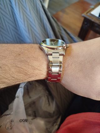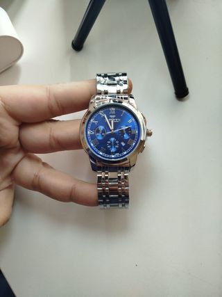 Vendo este reloj estilo Oyster de 40 mm, elegante y moderno, con caja y correa de acero inoxidable plateado y una preciosa esfera azul celeste que destaca muchísimo. Precio: 10 € — Nuevo con caja Características principales Caja: 40 mm Material: Acero inoxidable (caja y correa) Color: Plateado con esfera azul celeste Resistencia al agua: 30 m Incluye herramienta para ajustar la correa Incluye caja de presentación Servicio extra incluido Si nos dices tu talla de muñeca en cm, te ajustamos la correa a medida y te lo enviamos puesto en hora, listo para usar. Estado ✔️ Nuevo, sin estrenar ✔️ Diseño elegante y llamativo