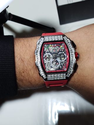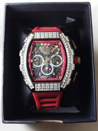 ✔ Caja tipo barril 44 mm – grande y contundente ✔ Bisel con circonitas tipo diamante – brillo espectacular ✔ Movimiento automático DG3804 – fiable y mecánico ✔ 3 subesferas FUNCIONALES: • Izquierda: día de la semana • Derecha: mes • Central: indicador 24 h ✔ Consulta día, mes y hora de un vistazo ✔ Caja de acero inoxidable – sólida y duradera ✔ Resistencia al agua 50 m – uso diario ✔ Correa roja de caucho premium – cómoda y resistente ✔ Nuevo a estrenar 📦 Incluye caja negra de regalo 🔥 Diseño lujo extremo con presencia brutal y mecánica real 💰 Precio imbatible para un reloj de este nivel 🎁 Perfecto para regalo