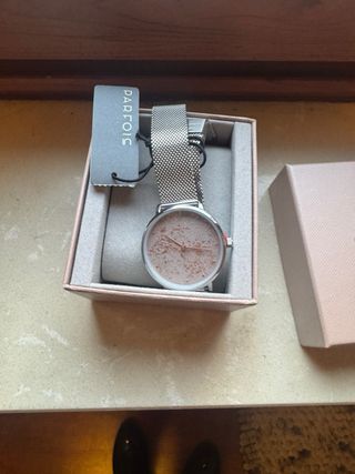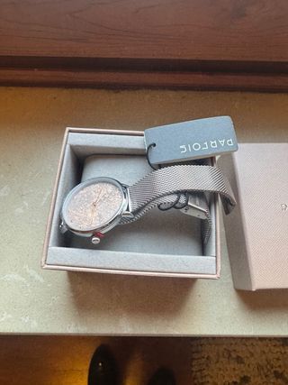 Elegante reloj de la marca Parfois con un diseño moderno. - Esfera con detalles brillantes. - Correa de malla metálica. - Cierre ajustable.