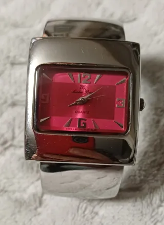Elegante reloj de pulsera con esfera rectangular. - Diseño moderno con detalles plateados. - Correa ancha y cómoda. - Esfera de color rosa vibrante.