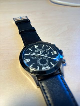 Reloj de pulsera con correa de cuero marrón y esfera negra. - Diseño moderno y elegante. - Correa de cuero. - Esfera redonda. - Cronómetro - Nuevo a estrenar