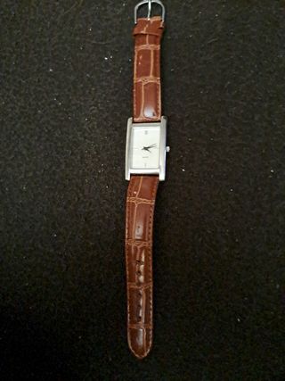 Elegante reloj SANDOZ de diseño rectangular. Se encuentra en perfecto estado. - Correa de piel marrón. - Caja de acero inoxidable plateada. - Esfera negra.