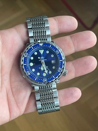 Reloj automático homenaje al mítico reloj japonés Tuna. En perfecto estado. En un azul muy potente. - Bisel giratorio. - Correa de metal. - Ventana de fecha. Preferible trato en mano pero se podría enviar previo pago Sg P