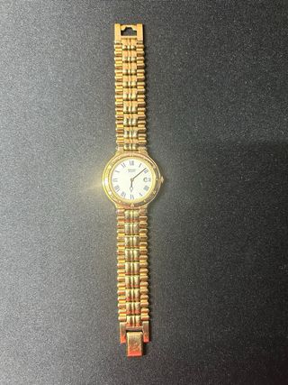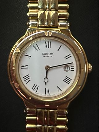 ¡Vendo bellísimo y elegantísimo reloj Seiko Avenue, con partes chapadas en oro y siendo un reloj Unisex! -Marca®️: Seiko 🇯🇵 -Referencia: 7N01-6270 A0 -Nº de serie: 190537 -Estado✅: en muy buen estado de conservación (alguna marca acorde a su antigüedad, pero cristal limpio) y funcionando perfectamente (pila recién cambiada). -Tamaño aprox.📏: 30,7mm sin contar la corona. -Color esfera🕢: blanco (tirando hacia color beige), con manecillas y marcadores en tono dorado. -Movimiento: Quartz. -Año de fabricación aprox.📆: 1991. -Material correa🎗️: acero original de Seiko. Mide de punta a punta 17,5cm.