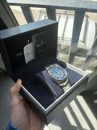 Elegante reloj Maserati con una esfera azul y detalles plateados. Precio negociable - Diseño moderno y sofisticado. - Caja y correa de acero inoxidable. - Presentado en su caja original Maserati.