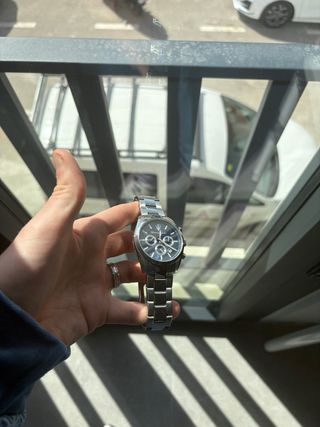 Reloj Citizen con tecnología Eco-Drive, que se carga con luz solar. Muy poco uso sin ningún arañazo ni señales de uso en la correa. - Esfera negra con detalles plateados y amarillos. - Correa de eslabones plateada. - Bisel con taquímetro.
