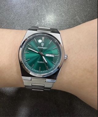 Elegante reloj con esfera verde y detalles plateados. - Diseño moderno y sofisticado. - Correa de acero inoxidable plateada. - Indicador de día y fecha.