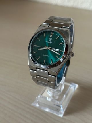 Elegante reloj clásico con esfera verde y detalles plateados. - Diseño moderno y atemporal. - Correa de acero inoxidable. - Indicador de día y fecha.