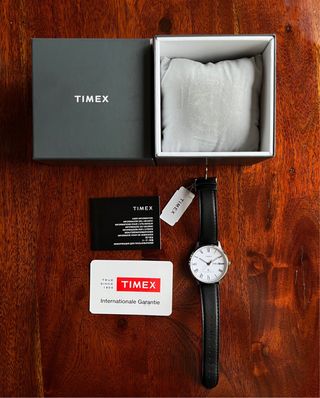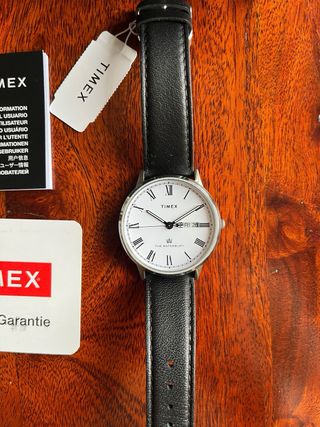 Reloj de muñeca Timex Waterbury Classic day/date. Diámetro 40mm, Grosor 10mm (aproximadamente) Caja de acero inoxidable y cristal mineral. Correa de cuero con doble pasador anchura 20mm y cierre de hebilla clásica. Esfera con iluminación INDIGLO, que se activa al presionar el botón lateral y agujas luminiscentes en la oscuridad.