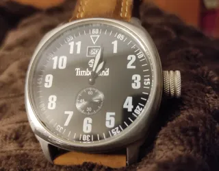 Reloj Timberland con correa de cuero marrón y esfera negra. - Correa de cuero. - Esfera con números grandes y detalles en blanco.