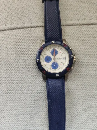 Reloj Adidas con cronógrafo y correa azul algo deteriorada por el interior (no visible). Funcionando, pero tiene poca batería. Necesita cambiar la pila. Con caja original e instrucciones. - Esfera blanca con detalles azules. - Bisel con indicaciones de puntos cardinales. - Correa de material sintético texturizado.